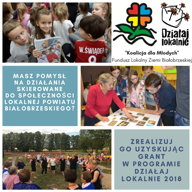 Program grantowy "Działaj Lokalnie"Odsłony: 1152 Więcej informacji: http://www.koalicjadlamlodych.org.pl/ogloszenia/241-zgarnij-kase-na-realizacje-swojego-pomyslu