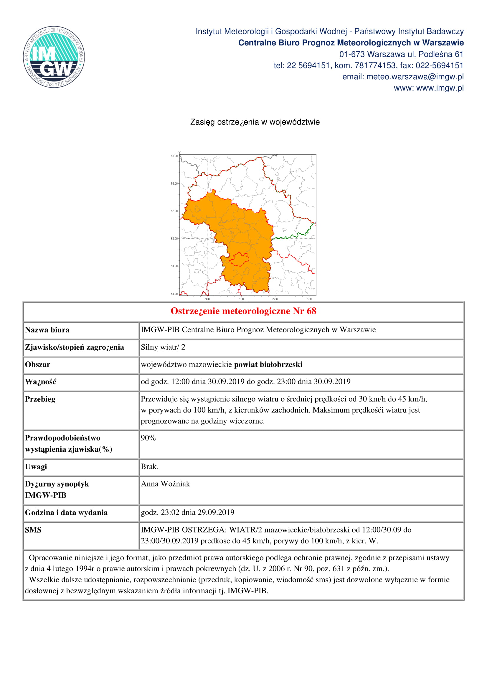 Ostrzeżenie meteorologiczne Nr 68Odsłony: 1280 Przewiduje się wystąpienie silnego wiatru o średniej prędkości od 30 km/h do 45 km/h, w porywach do 100 km/h, z kierunków zachodnich. Maksimum prędkośći wiatru jest prognozowane na godziny wieczorne.