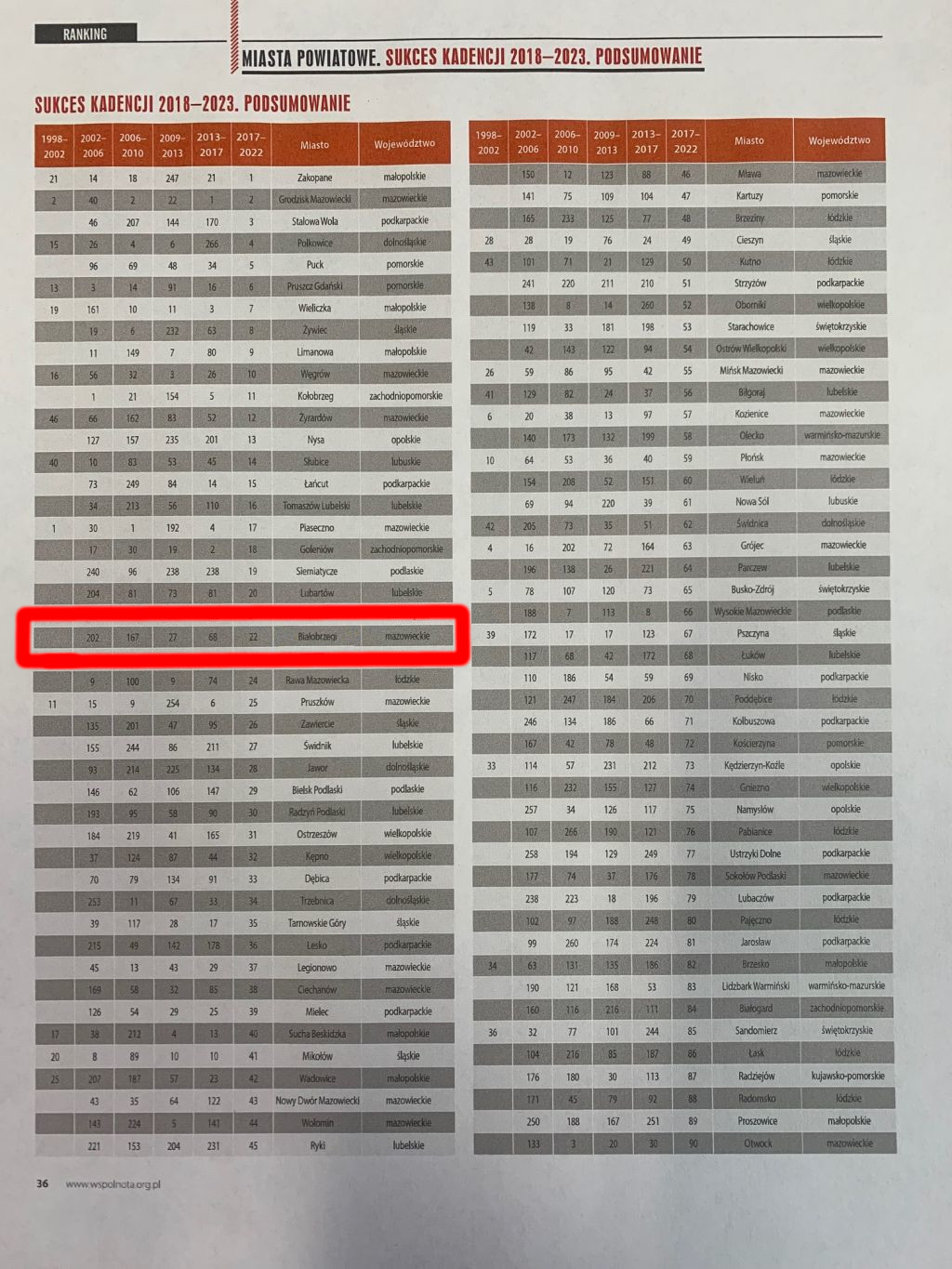 Pismo Samorządu Terytorialnego „Wspólnota” ogłosiło ranking, podsumowujący mijającą kadencję samorządów. Białobrzegi znalazły się na 22 miejscu w Polsce wśród miast powiatowych, które osiągnęły najlepsze wskaźniki.