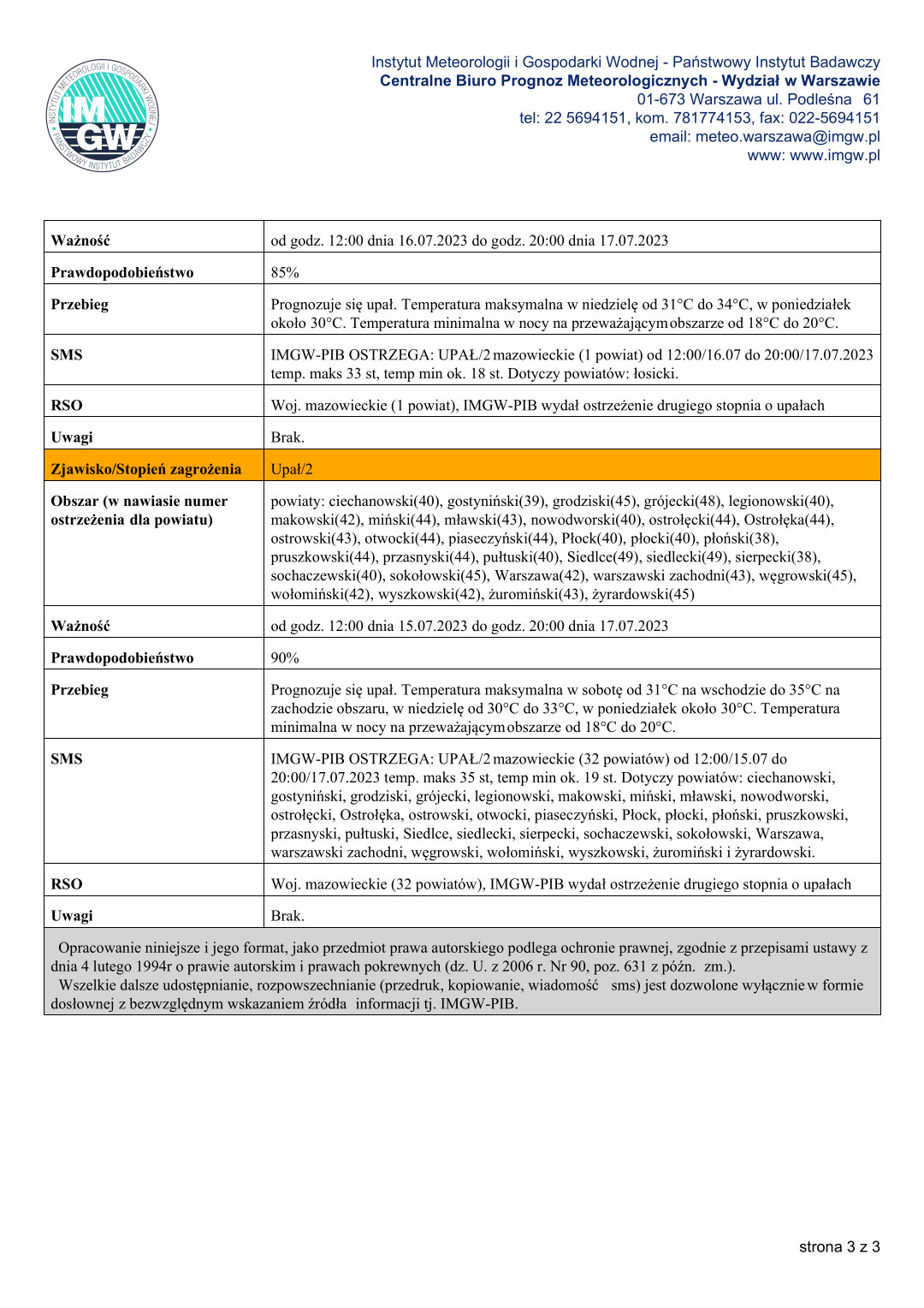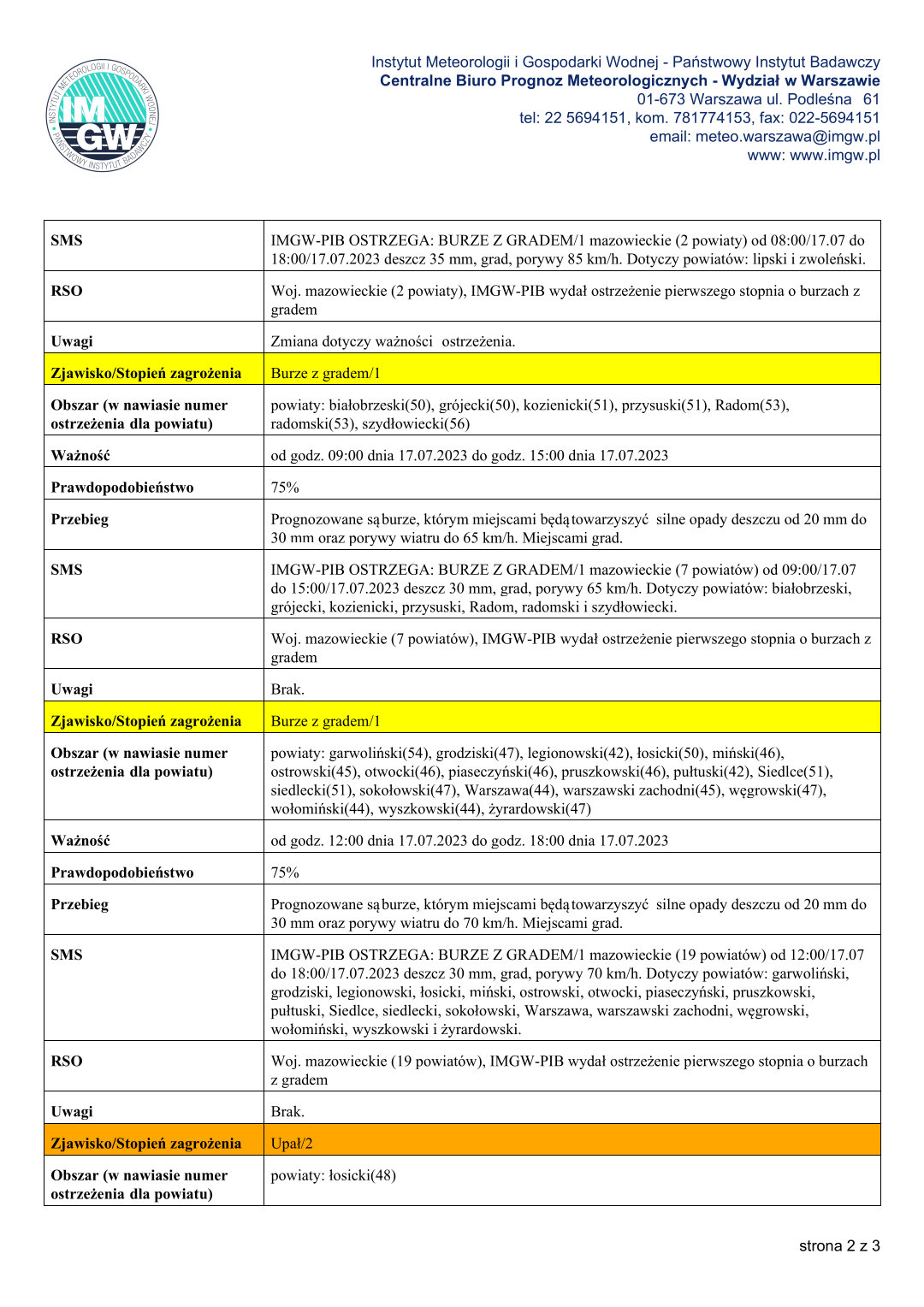 WOJEWÓDZTWO MAZOWIECKIE OSTRZEŻENIA METEOROLOGICZNE ZBIORCZO NR 138 WYKAZ OBOWIĄZUJĄCYCH OSTRZEŻEŃOdsłony: 307