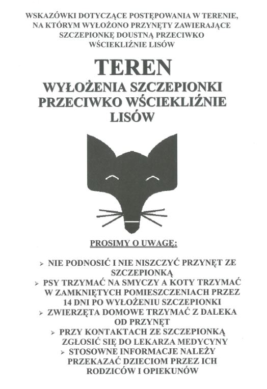 Na podstawie przepisów Rozporządzenia Ministra Rolnictwa i Rozwoju Wsi z dnia 17 grudnia 2013 r. w sprawie przeprowadzania ochronnych szczepień lisów wolno żyjących przeciwko wściekliźnie (Dz. U. poz. 1737)