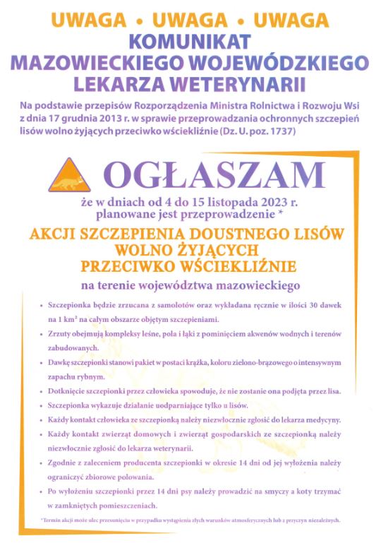 W dniach od 4 do 15 listopada 2023 r. planowane jest przeprowadzenie akcji szczepienia ochronnego lisów wolno żyjących przeciwko wściekliźnie.