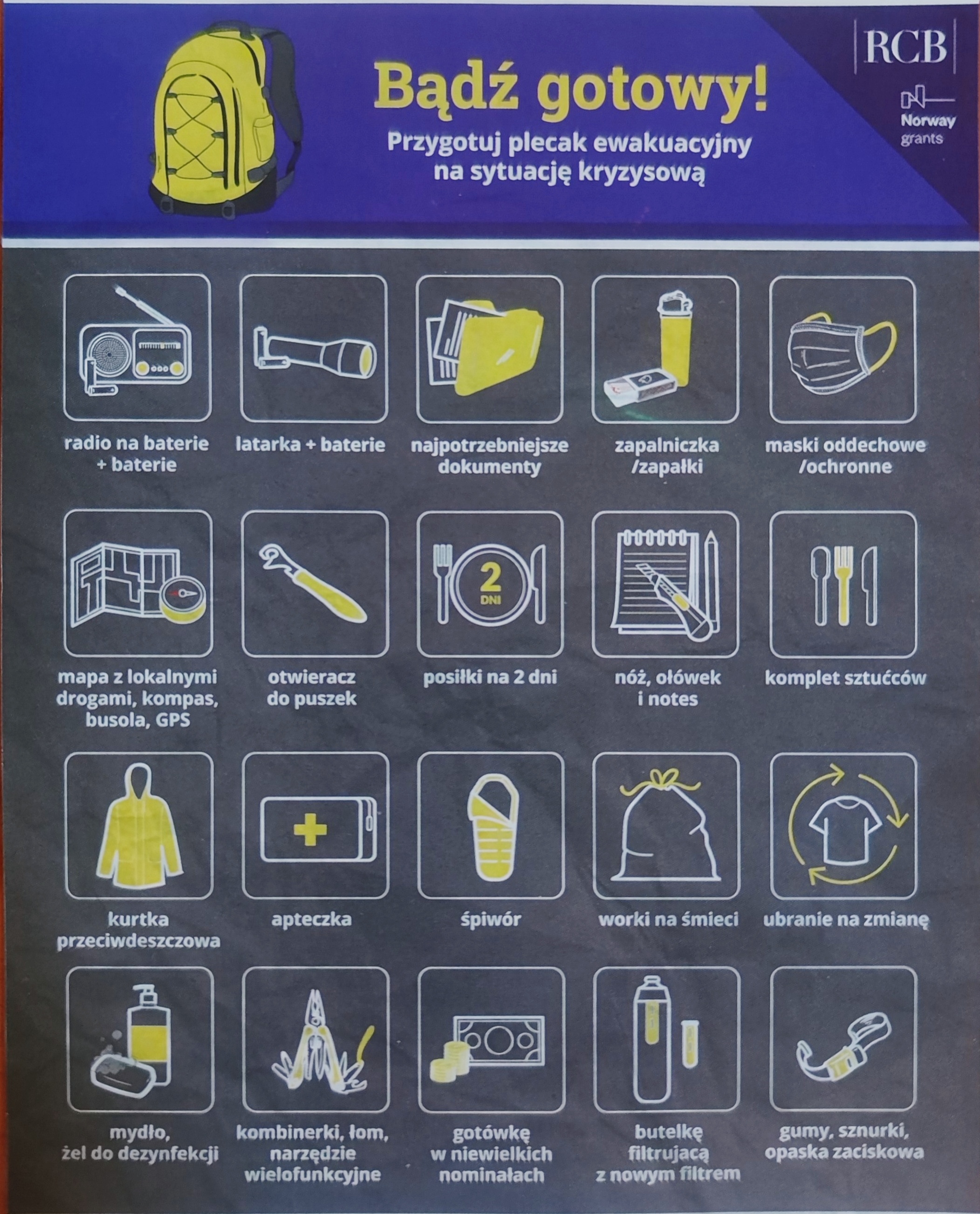 Poniżej przedstawiamy niezbędne informacje oraz listę przedmiotów, które powinny znaleźć się w plecaku ewakuacyjnym oraz zasady bezpieczeństwa w przypadku zagrożenia eksplozją.