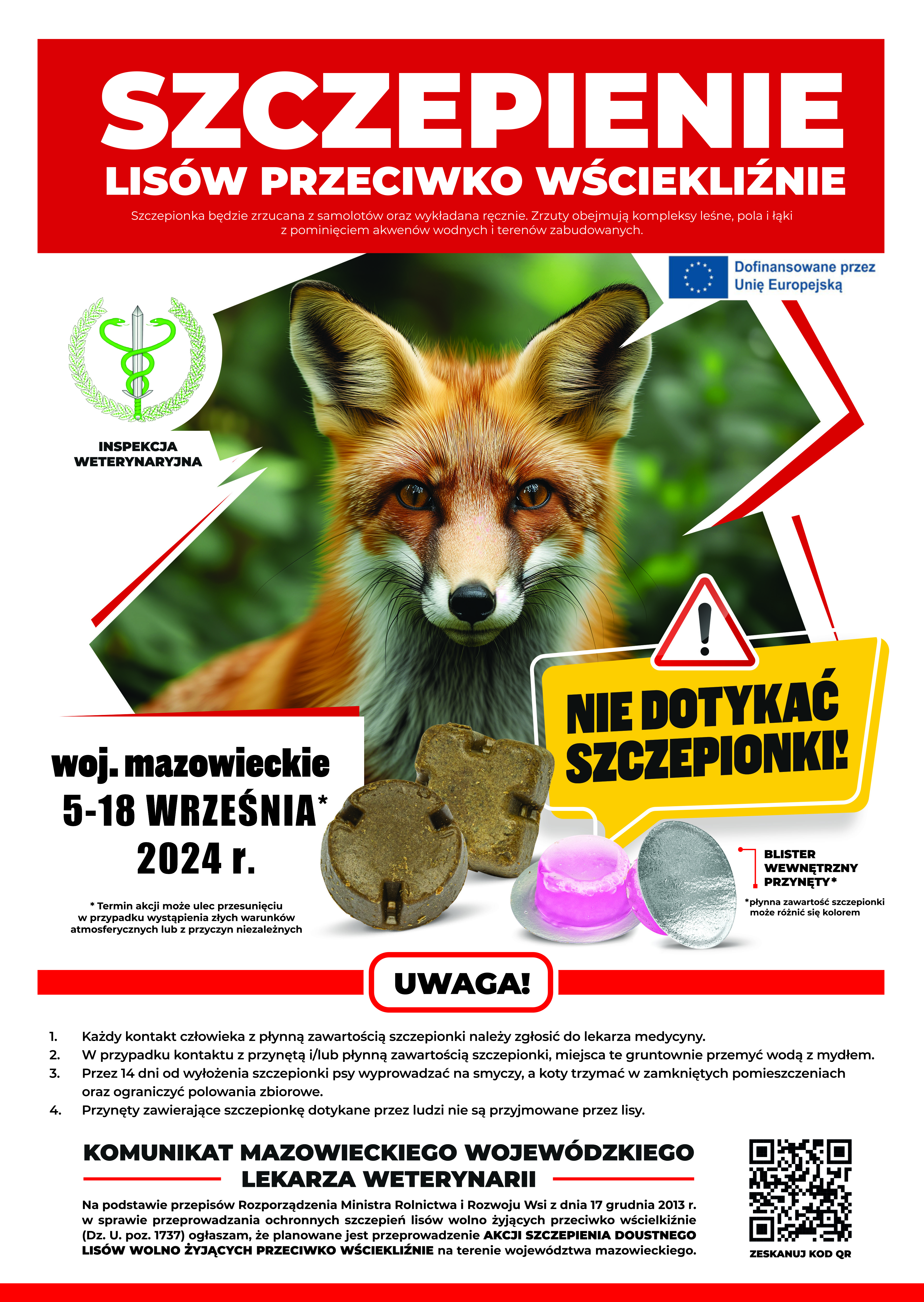 Mazowiecki Wojewódzki Lekarz Weterynarii uprzejmie informuje, że w dniach 5-18 września 2024 r. przeprowadzona zostanie jesienna akcja szczepień ochronnych lisów wolno żyjących przeciwko wściekliźnie na terenie województwa mazowieckiego.