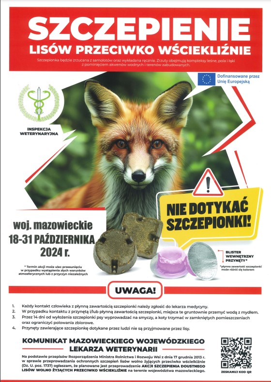 Mazowiecki Wojewódzki Lekarz Weterynarii informuje, że w dniach 18-31 października 2024 roku na terenie województwa mazowieckiego odbędzie się jesienna akcja szczepień ochronnych lisów wolno żyjących przeciwko wściekliźnie.