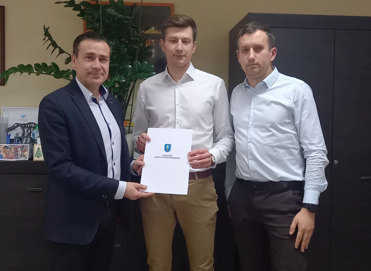 Firma Charter Group zainwestuje w Specjalnej Strefie Ekonomicznej w Białobrzegach. Burmistrz Adam Bolek oraz inwestorzy Korol Ślusarczyk i Cezary Ślusarczyk podpisali akt notarialny sprzedaży działek przemysłowych.