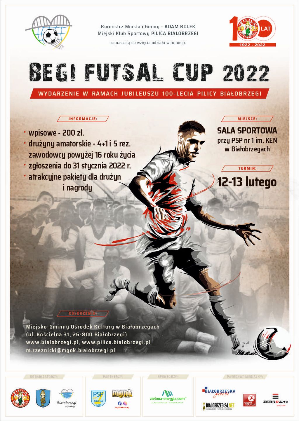 Zapraszamy wszystkich miłośników piłki nożnej do wzięcia udziału w II edycji turnieju halowej piłki nożnej o Puchar Burmistrza Miasta i Gminy Białobrzegi – BEGI FUTSAL CUP 2022. Tegoroczna edycja odbywać się będzie w ramach jubileuszu 100-lecia klubu sportowego Pilica Białobrzegi.
