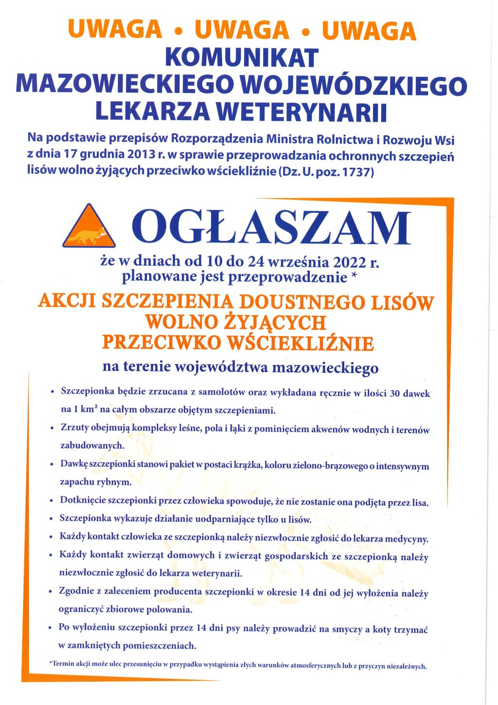 Na podstawie przepisów Rozporządzenia Ministra Rolnictwa i Rozwoju Wsi z dnia 17 grudnia 2013 r. w sprawie przeprowadzania ochronnych szczepień lisów wolno żyjących przeciwko wściekliźnie (Dz. U. poz. 1737)