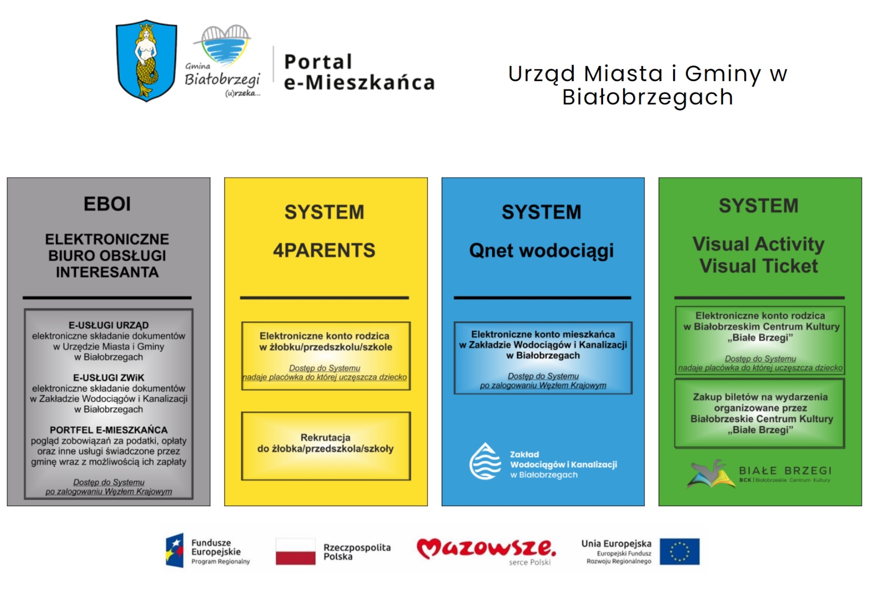 Gmina Białobrzegi uruchomiła dla mieszkańców dedykowany portal internetowy pn. Portal e-Mieszkańca umożliwiający realizację ponad 30 spraw urzędowych w tym wniosków, oświadczeń i deklaracji drogą elektroniczną bez konieczności przychodzenia do Urzędu Miasta, Zakładu Wodociągów i Kanalizacji oraz Białobrzeskiego Centrum Kultury „Białe Brzegi” w Białobrzegach. Ponadto, mieszkańcy mogą elektronicznie rozliczać się za wodę i ścieki, zapisać dziecko do placówek oświatowych, płacić za posiłki w placówce, zapisać dziecko na zajęcia do BCK-u i je opłacić oraz także zakupić bilet na organizowane wydarzenia kulturalne czy seans filmowy. Uruchomiono funkcjonalność pn. PORTFEL E-MIESZKAŃCA, w której mieszkaniec może zobaczyć swoje zobowiązania oraz nadchodzące płatności za podatki, opłaty za śmieci czy za wodę i opłacić je za pośrednictwem platformy BLUE MEDIA. Zapraszamy do rejestracji i poznania pełnej funkcjonalności oferowanych usług. Dostęp na Portalu jest możliwy przez: