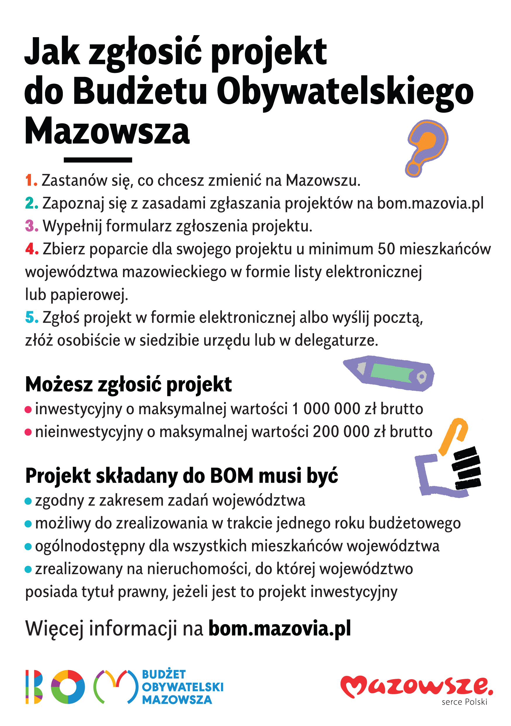 Szczegółowe informacje na temat budżetu obywatelskiego znajdują się na stronie: https://bom.mazovia.pl/.