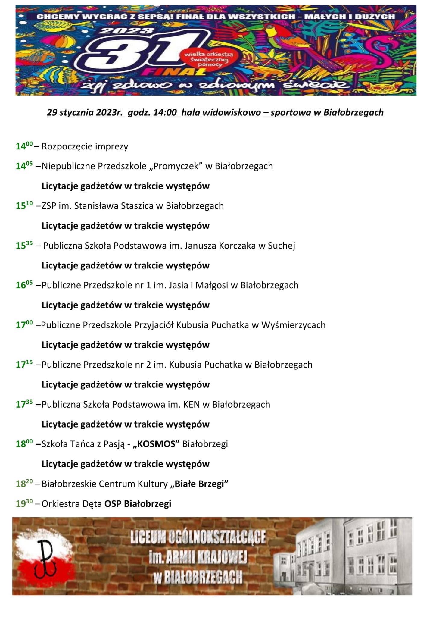 To już 31 Finał Wielkiej Orkiestry Świątecznej Pomocy. W tym roku oprócz zbiórki ulicznej, prowadzonej przez wolontariuszy, w hali sportowej przy LO odbędą się również licytacje, występy grup tanecznych przedszkolaków i dzieci m. in. z Białobrzeskiego Centrum Kultury i szkoły tańca Kosmos. Na zakończenie zagra Orkiestra Dęta Ochotniczej Straży Pożarnej w Białobrzegach. Początek o godzinie 14.00.