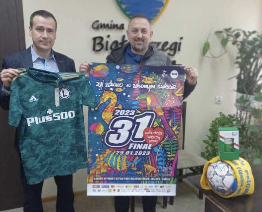 Burmistrz Adam Bolek na ręce szefa białobrzeskiego sztabu WOŚP Sylwestra Falkowskiego, przekazał do licytacji koszulkę meczową Legii Warszawa oraz piłkę z autografami piłkarzy wicemistrza Belgii Royale Union Saint-Gilloise wraz z szalikiem.
