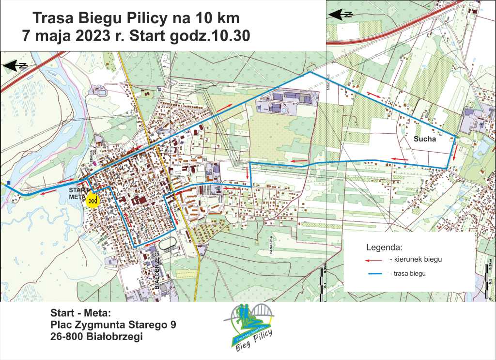 Bieg główny na 10 km odbędzie się w godz. 10.30 – 12.00 i będzie przebiegać ulicami: start na Placu Zygmunta Starego – następnie biegacze pobiegną na most gdzie zawrócą i ul. Krakowską pobiegną w kierunku Suchej (ul. Kasztanowa, Białobrzeska) i z powrotem do Białobrzegów (ulica Żeromskiego, Broniewskiego, Kamińskiego, Reymonta, 11 Listopada, Kusocińskiego, Kościelna, Żeromskiego i Plac Zygmunta Starego). Start i meta zostały zaplanowane na Placu Zygmunta Starego przed Ratuszem. Wspólna rozgrzewka dla zawodników o godz. 10.15. Pakiety startowe można odbierać od godz.8.30 w biurze zawodów (1 piętro w budynku Urzędu).