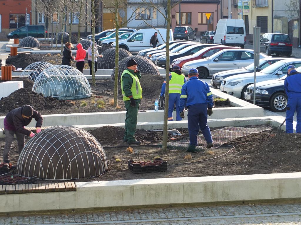 W istniejących betonowych gazonach trwają prace mineralizacji i spulchnienia gleby wymieniana jest część podłoża oraz roślinność. Zmianie ulegnie również ukształtowanie terenu poprzez wprowadzenie małych form architektury oraz wykonanie nasadzeń: