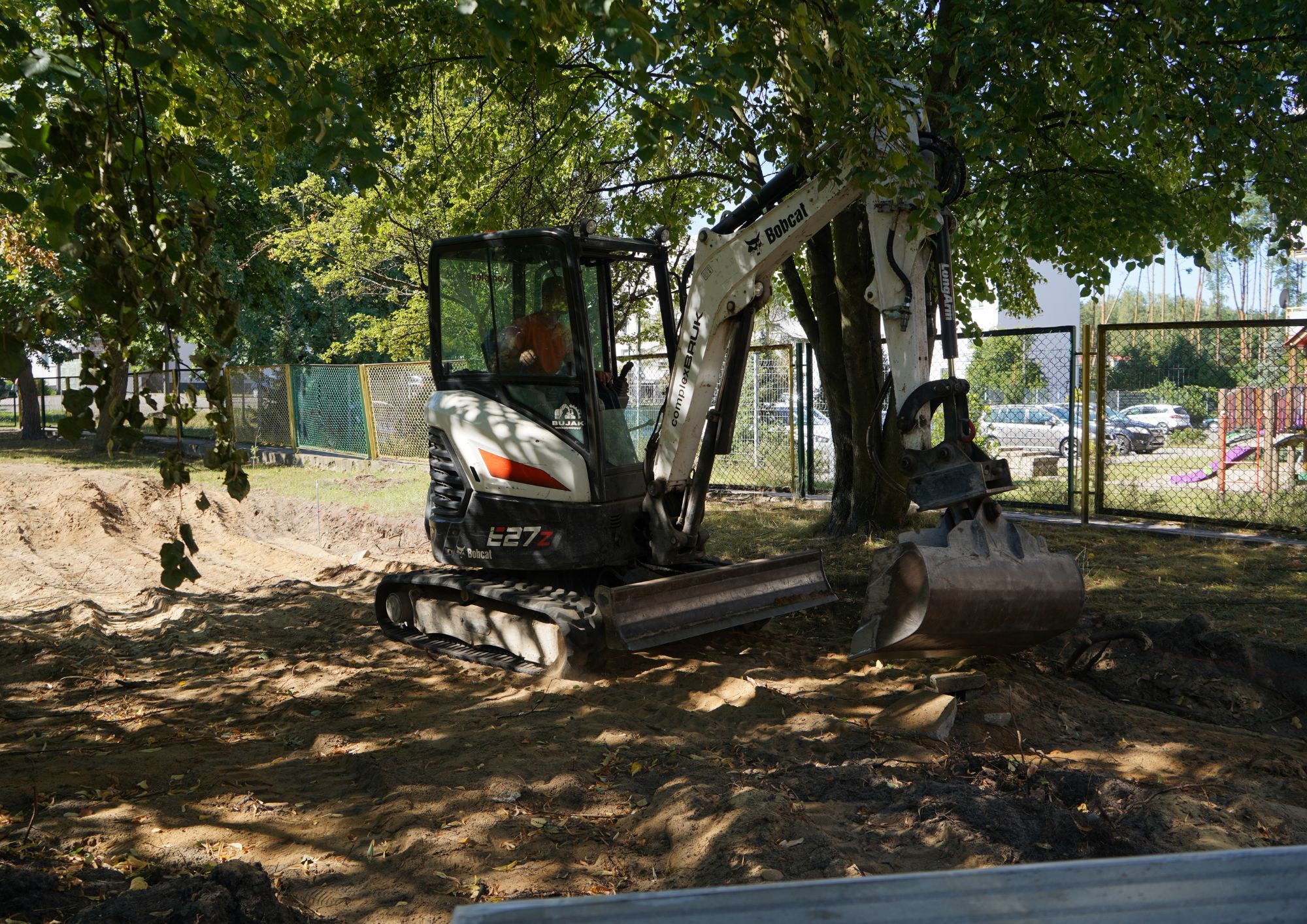 Pierwszy etap prac obejmował demontaż starych zabawek oraz usunięcie starej nawierzchni z ścieżek. Dzięki starannemu podejściu wykonawców, zieleń wokół placu zabaw nie ucierpiała – drzewa pozostaną integralną częścią nowego zagospodarowania.