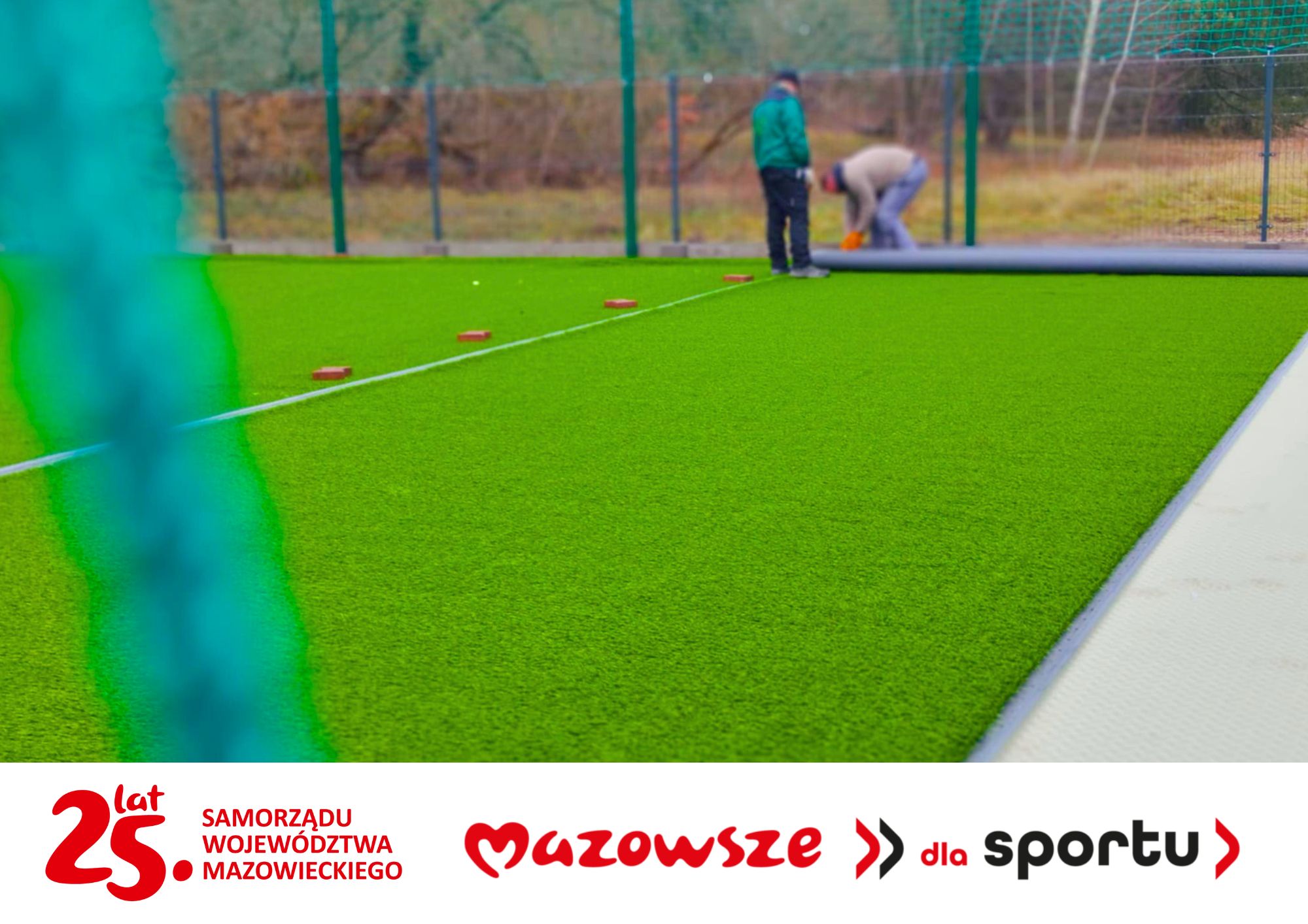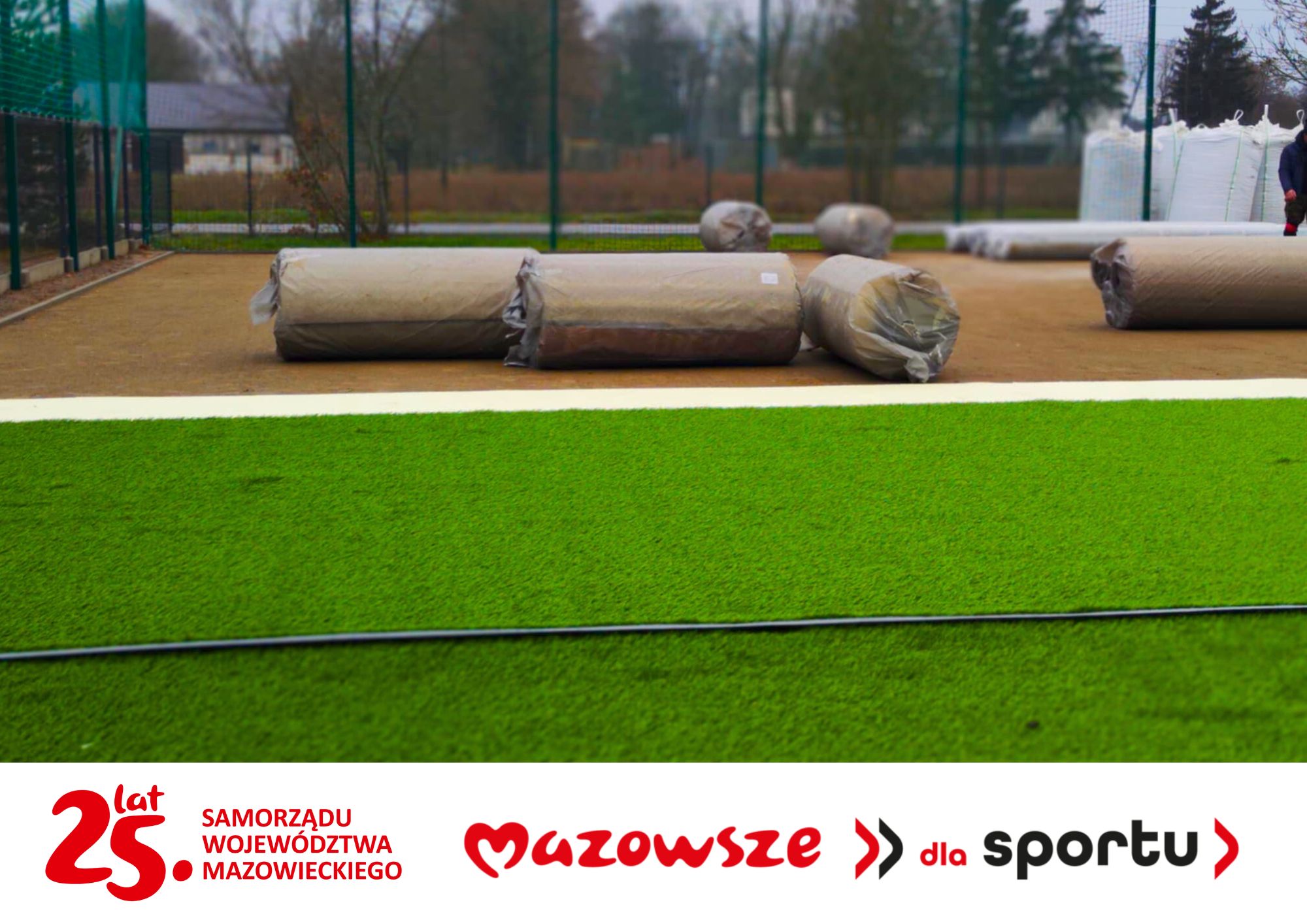 Obecnie trwają intensywne prace związane z układaniem sztucznej trawy, która będzie stanowiła nowoczesną nawierzchnię boiska piłkarskiego.