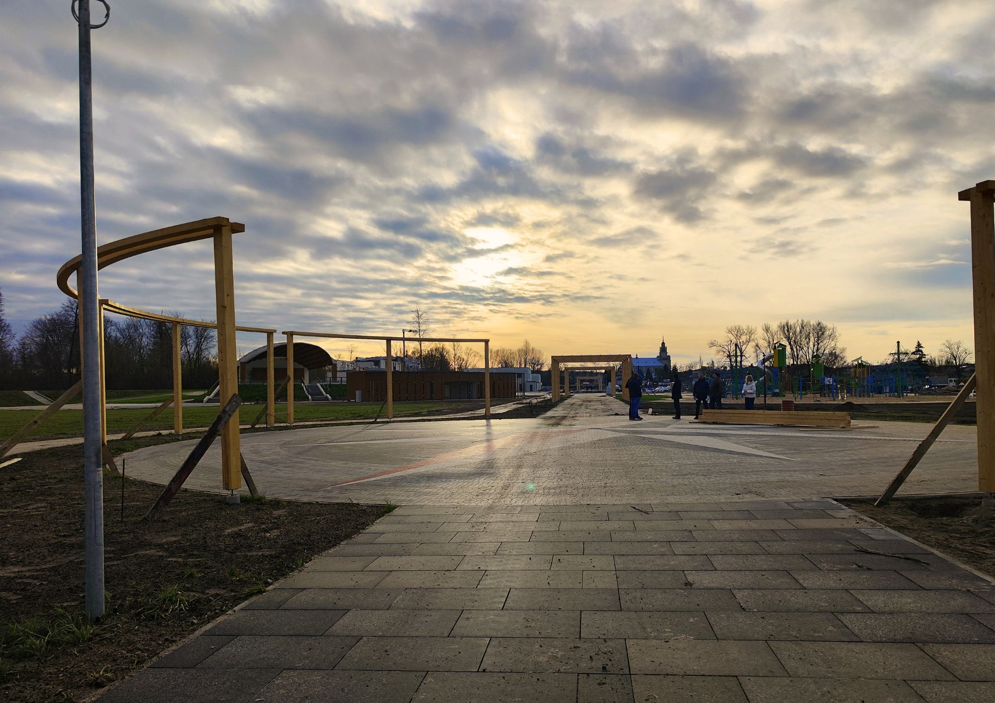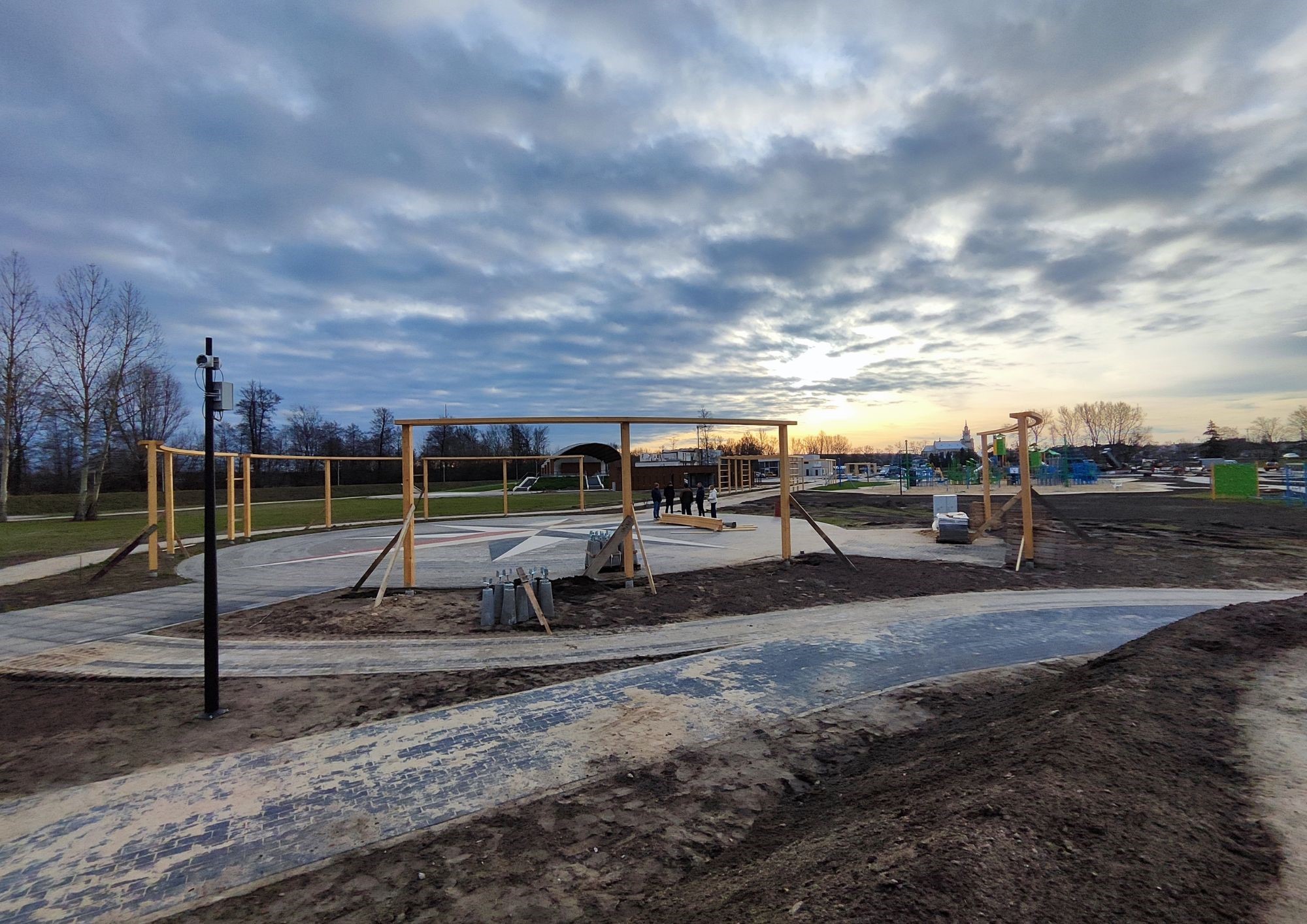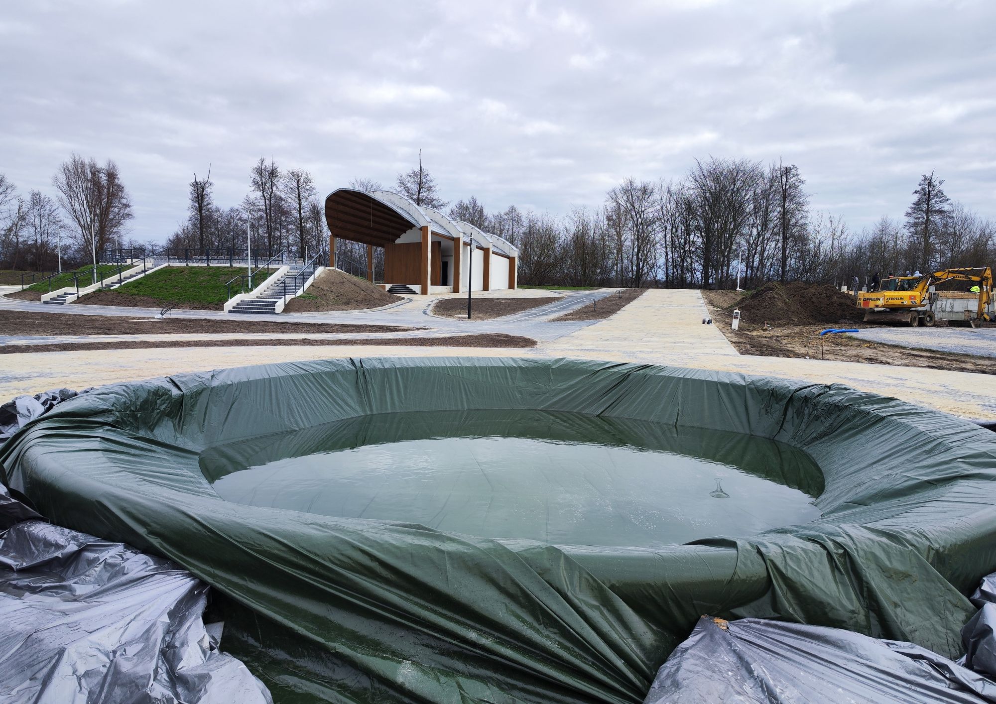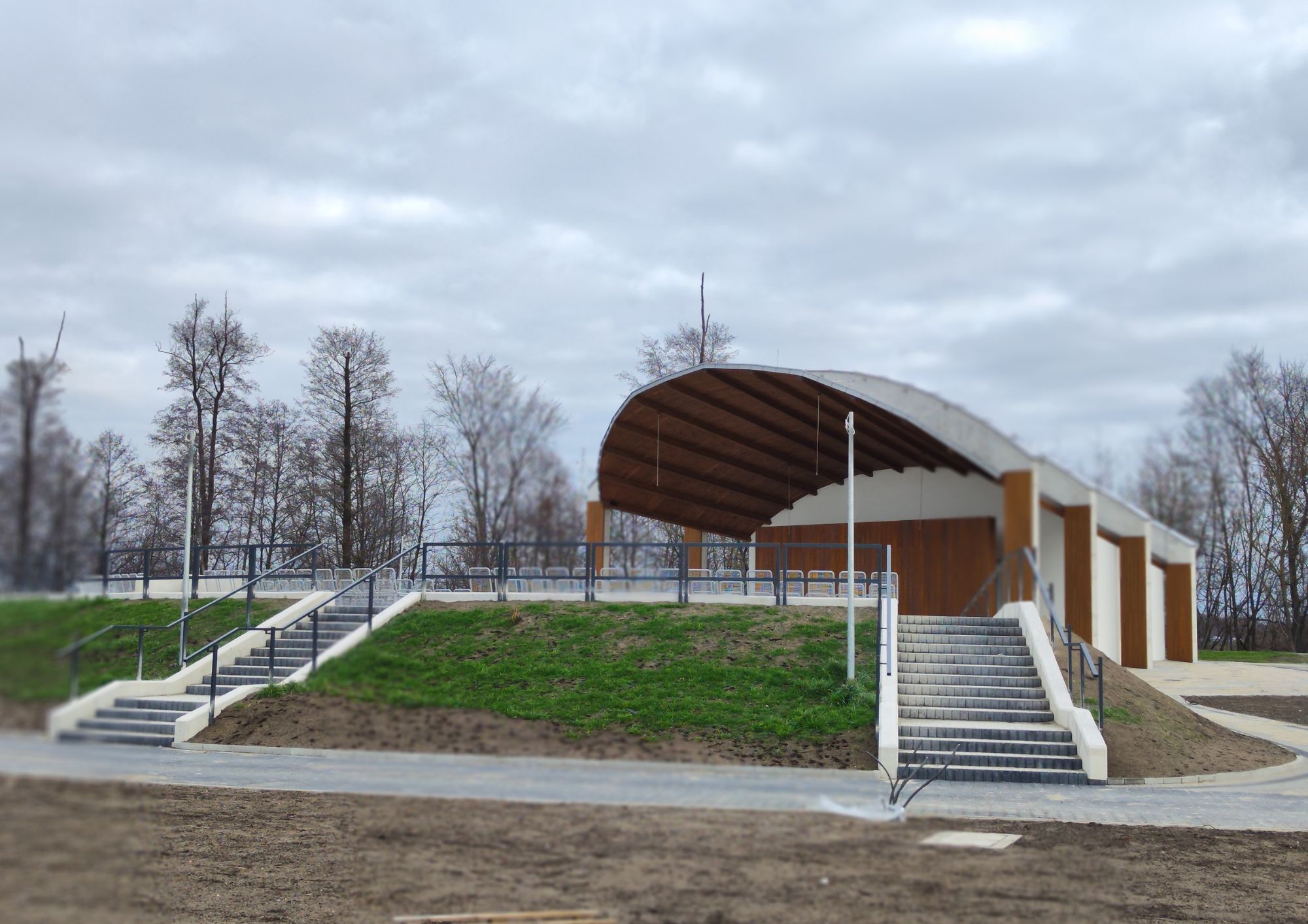 Na różnych etapach realizacji znajdują się kluczowe elementy inwestycji. Powstaje nowoczesny amfiteatr, który ma stać się sercem nowych terenów rekreacyjnych, a obok niego budowane są: