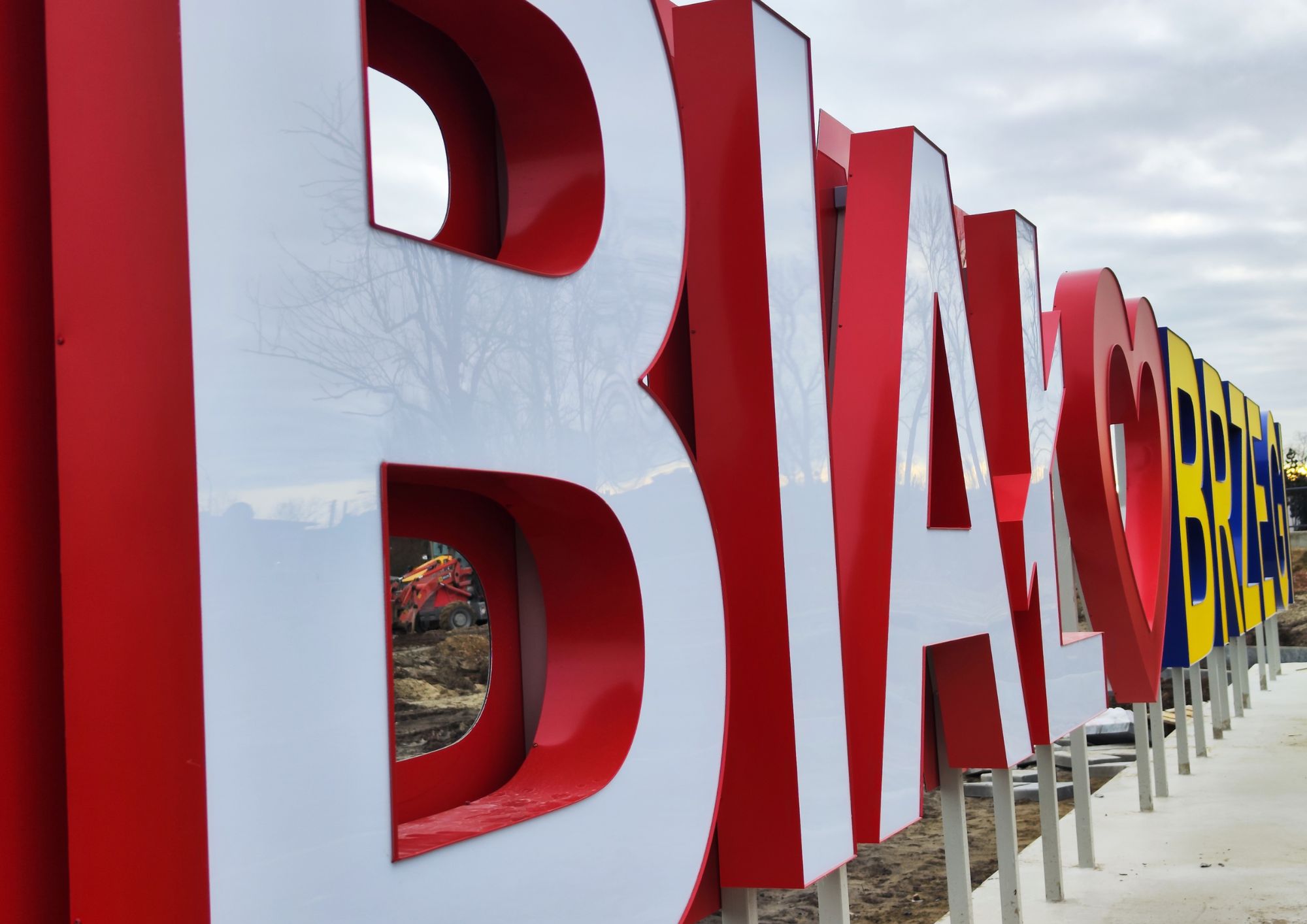 Symbolika projektu napisu, nawiązuje do barw loga i herbu Białobrzegów: żółty (złoty) to kolor piasku, kolor ogona i włosów białobrzeskiej syrenki, niebieski to rzeka Pilica i tło naszego herbu, biało czerwone to barwy narodowe. Napis w nocy będzie świecił w barwach biało-żółtej (białe gęsi na żółtym piasku). Ideą projektu napisu było również „wydobycie” nazwy BRZEGI (kolor żółty). To nawiązanie do pierwotnej nazwy naszego miasta. Serce to oczywiście symbol miłości do naszych Białobrzegów i łącznik pomiędzy starą nazwą miasta a dzisiejszą.