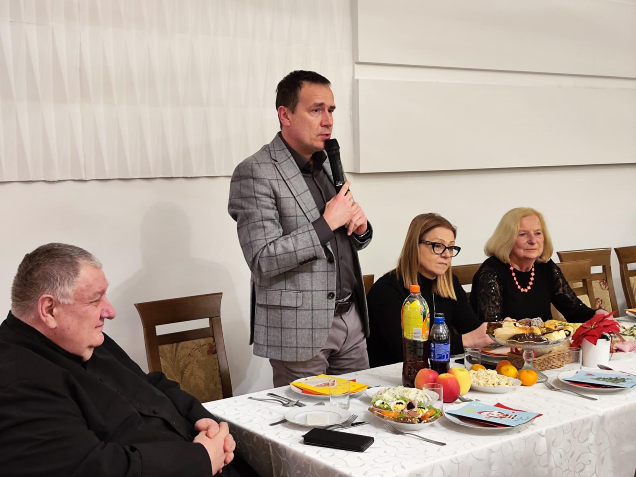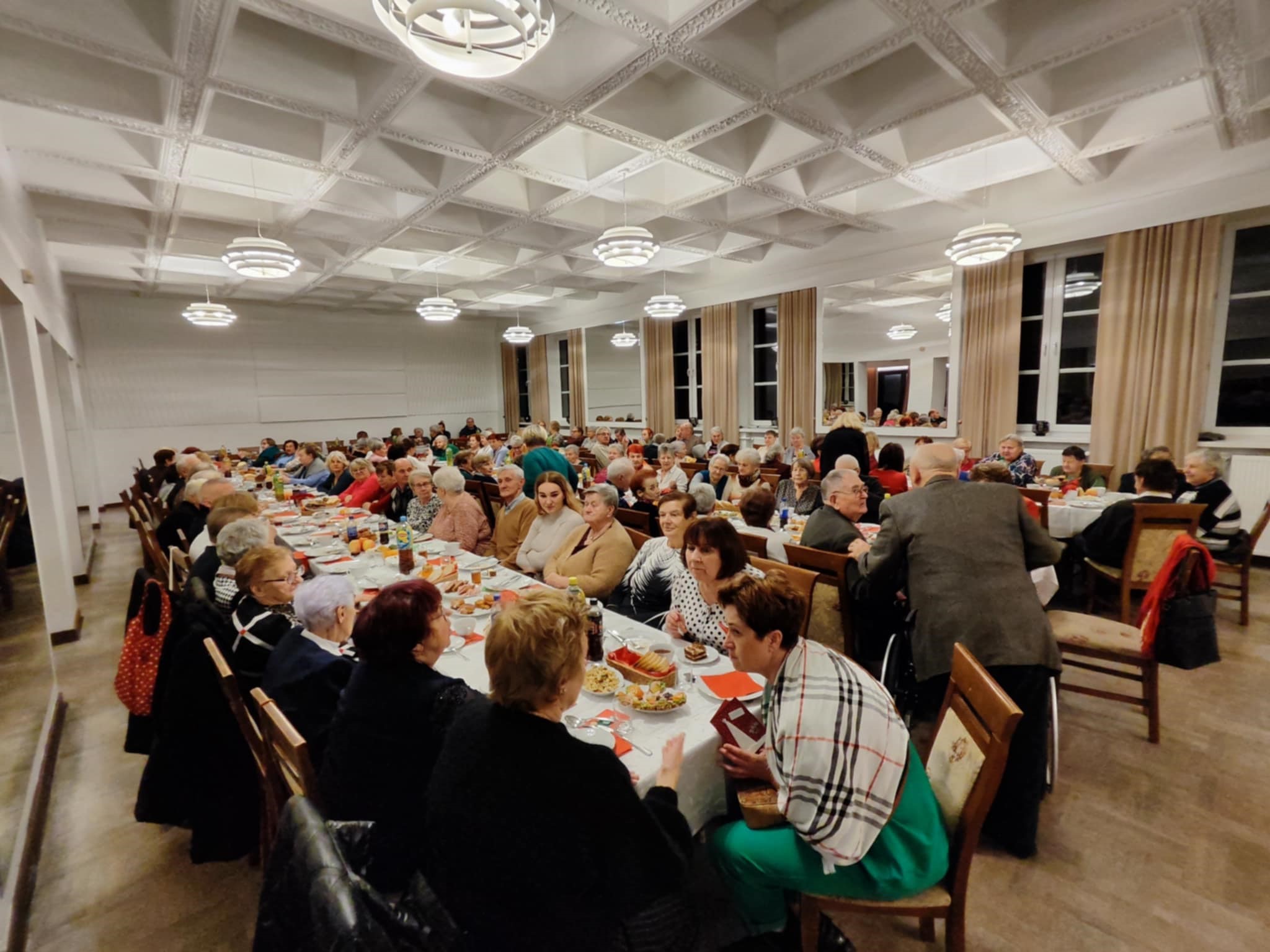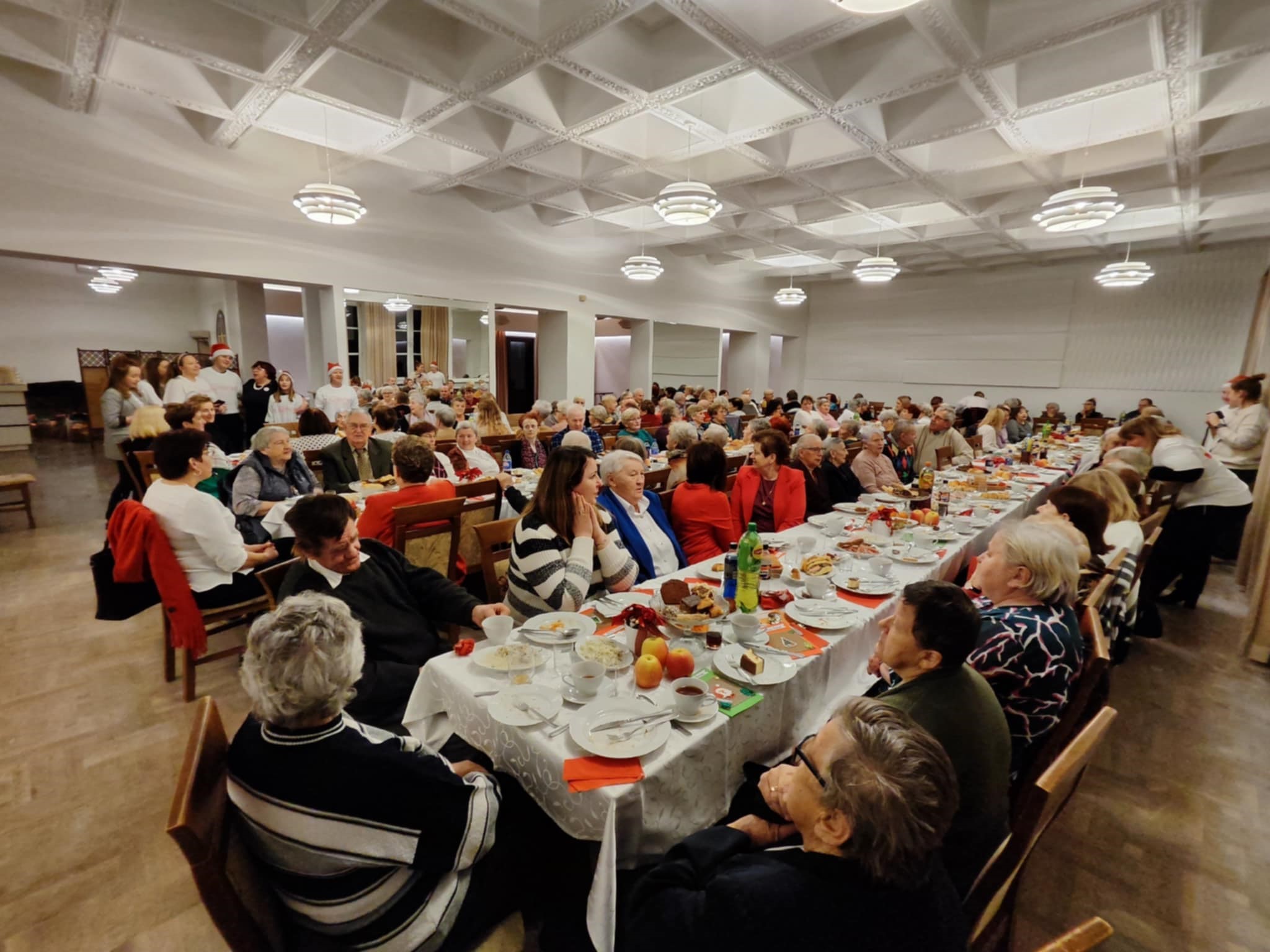 W pięknie udekorowanej sali czekał na seniorów tradycyjny wigilijny poczęstunek, w tym barszcz, pierogi, ryby i inne świąteczne smakołyki. Nie zabrakło opłatka, którym uczestnicy dzielili się, składając sobie życzenia zdrowia, pomyślności i spokoju. Atmosferę dopełniały kolędy, które wspólnie śpiewano, tworząc niezapomniany klimat.
