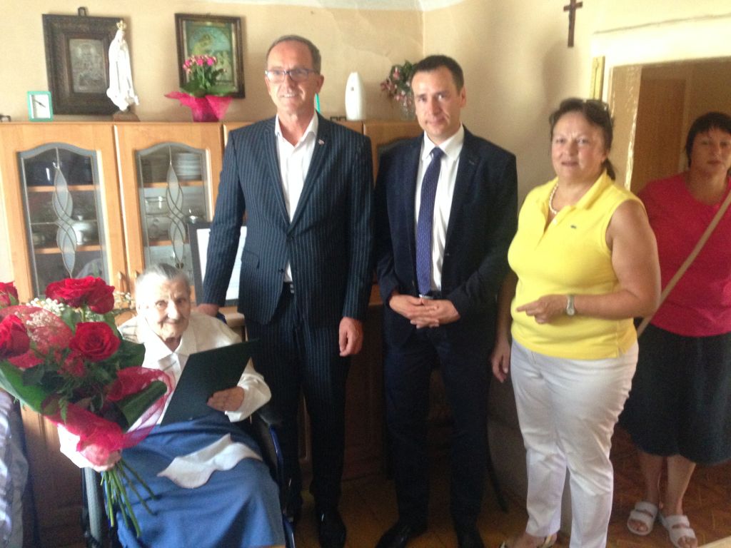 W dniu setnych urodzin, w obecności najbliższej rodziny, życzenia jubilatce złożyli: Adam Bolek burmistrz Białobrzegów, Krzysztof Murawski kierownik delegatury wojewody mazowieckiego w Radomiu oraz Pani Melania Furmańczyk kierownik placówki Zakładu Ubezpieczeń Społecznych w Grójcu.