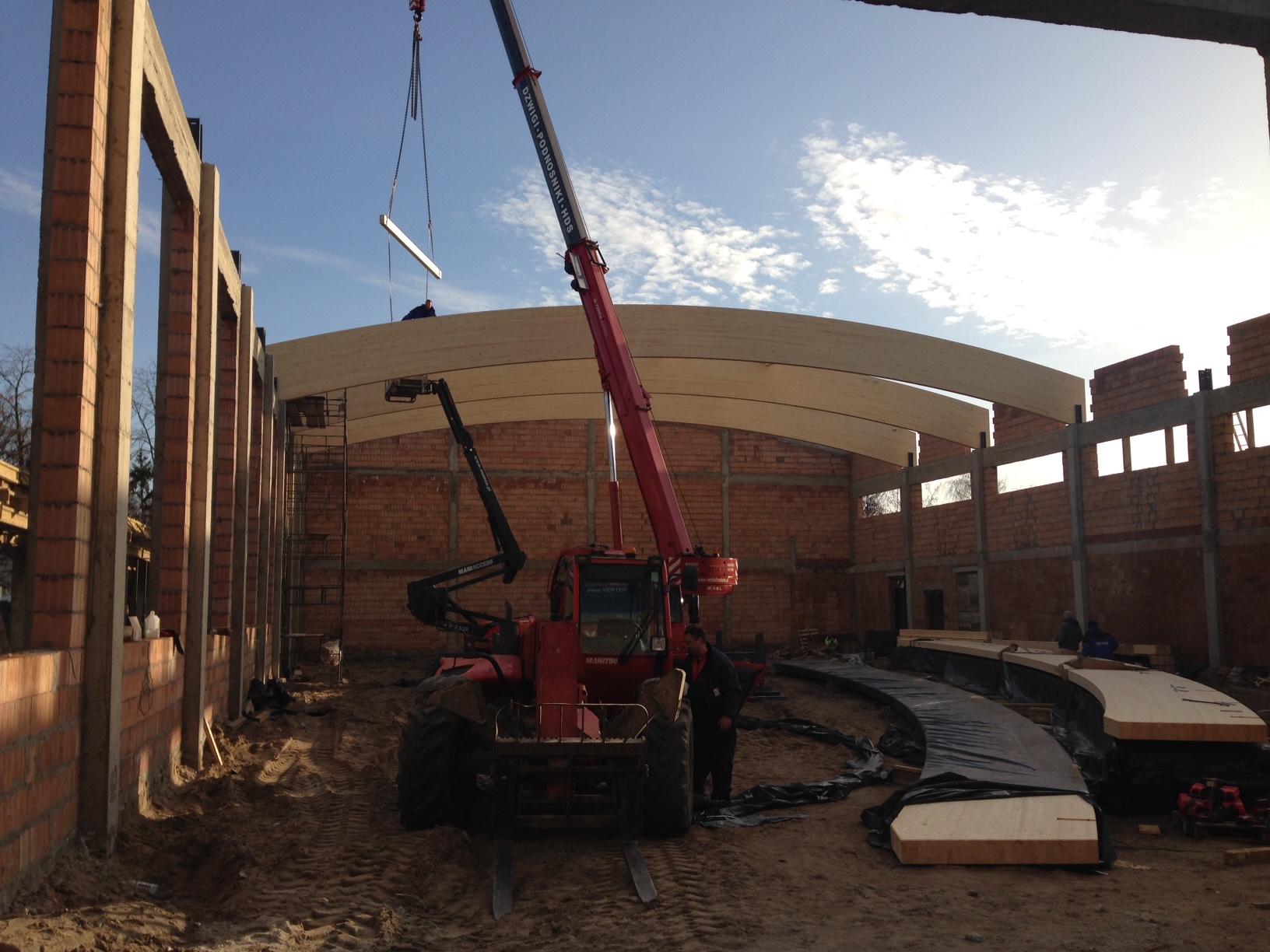 Budowa hali nabiera tempa. Wykonano prawie wszystkie prace murarskie i przystąpiono do przygotowywania konstrukcji dachu. Obecnie montowane są dźwigary o rozpiętości 24 metrów z drewna klejonego. Połączą one ściany nośne i na nich położona będzie konstrukcja dachu. Pokrycie dachem hali pozwoli przystąpić do prac wewnątrz budynku.