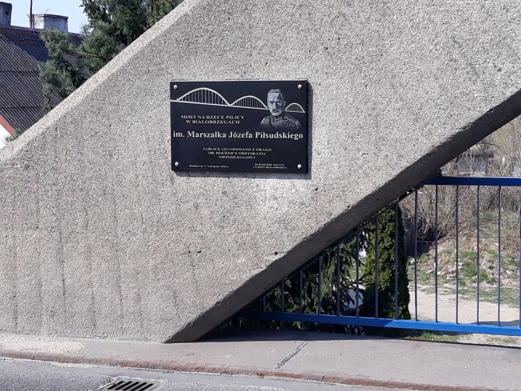 Przypomnijmy, 11 listopada 2018 roku, podczas uroczystych obchodów Święta Niepodległości, odsłonięto tablicę nadającą imię Marszałka Józefa Piłsudskiego Białobrzeskiemu Mostowi nad Pilicą. Odsłonięcia tablicy dokonali wtedy Bartosz Chochlewicz i Antoni Fołtyn, uczniowie białobrzeskich szkół urodzeni w dniu 11 listopada. Wcześniej, tj. 30 września 2013 roku, Rada Miasta i Gminy Białobrzegi podjęła uchwałę nadającą mostowi w Białobrzegach imię Marszałka Józefa Piłsudskiego.