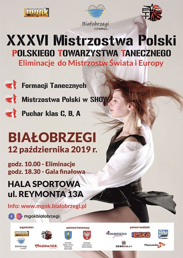 Mistrzostwa Polski w Białobrzegach są jednocześnie eliminacjami Mistrzostw Świata i Europy. Turniej odbędzie się w trzech kategoriach tanecznych: formacji tanecznych, Mistrzostw Polski w SHOW i kategorii C, B, A. Patronat nad mistrzostwami objęli: Marszałek woj. mazowieckiego Adam Struzik, wicemarszałek Rafał Rajkowski i burmistrz Adam Bolek. Organizatorem wydarzenia jest Miejsko Gminny Ośrodek Kultury. Do 9 października w MGOK-u można odebrać bezpłatne wejściówki na to wydarzenie. Serdecznie zapraszamy.