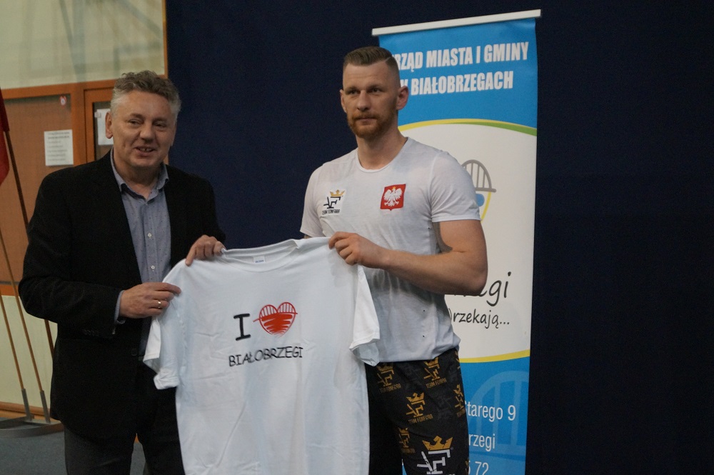 Andrzej Fonfara – Polski Książe – otrzymał z rąk zastępcy burmistrza Mieczysława Danielewicza koszulkę „I love Białobrzegi” w podziękowaniu za wizytę w naszym mieście.