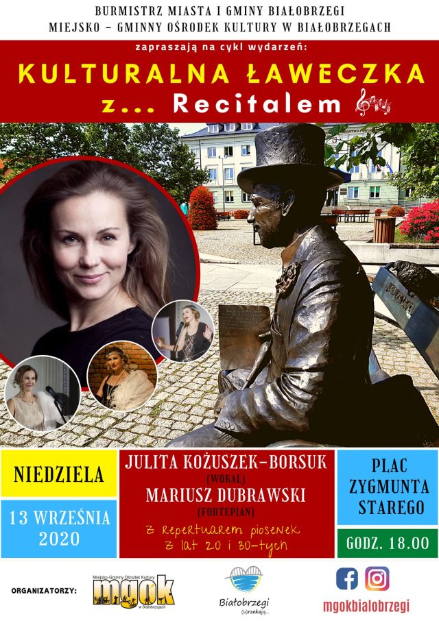 Serdecznie zapraszamy na kolejną odsłonę „Kulturalnej Ławeczki z…” - tym razem z recitalem najpiękniejszych piosenek oraz monologów z lat dwudziestych i trzydziestych w wykonaniu Julity Kożuszek-Borsuk. Recital odbędzie się w niedzielę 13 września na Placu Zygmunta Starego o godz. 18.00.